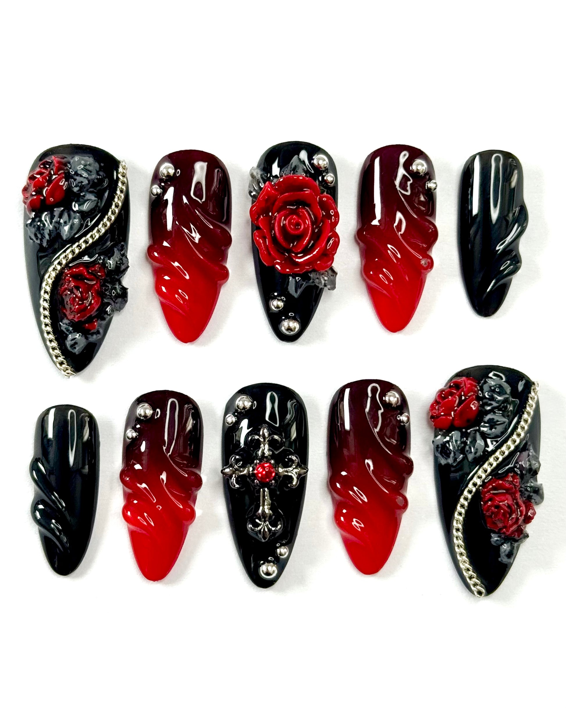 Roses en relief, croix gothique, chaînes argentées et courbes fluides : chaque détail est pensé pour évoquer la dualité entre désir et danger…