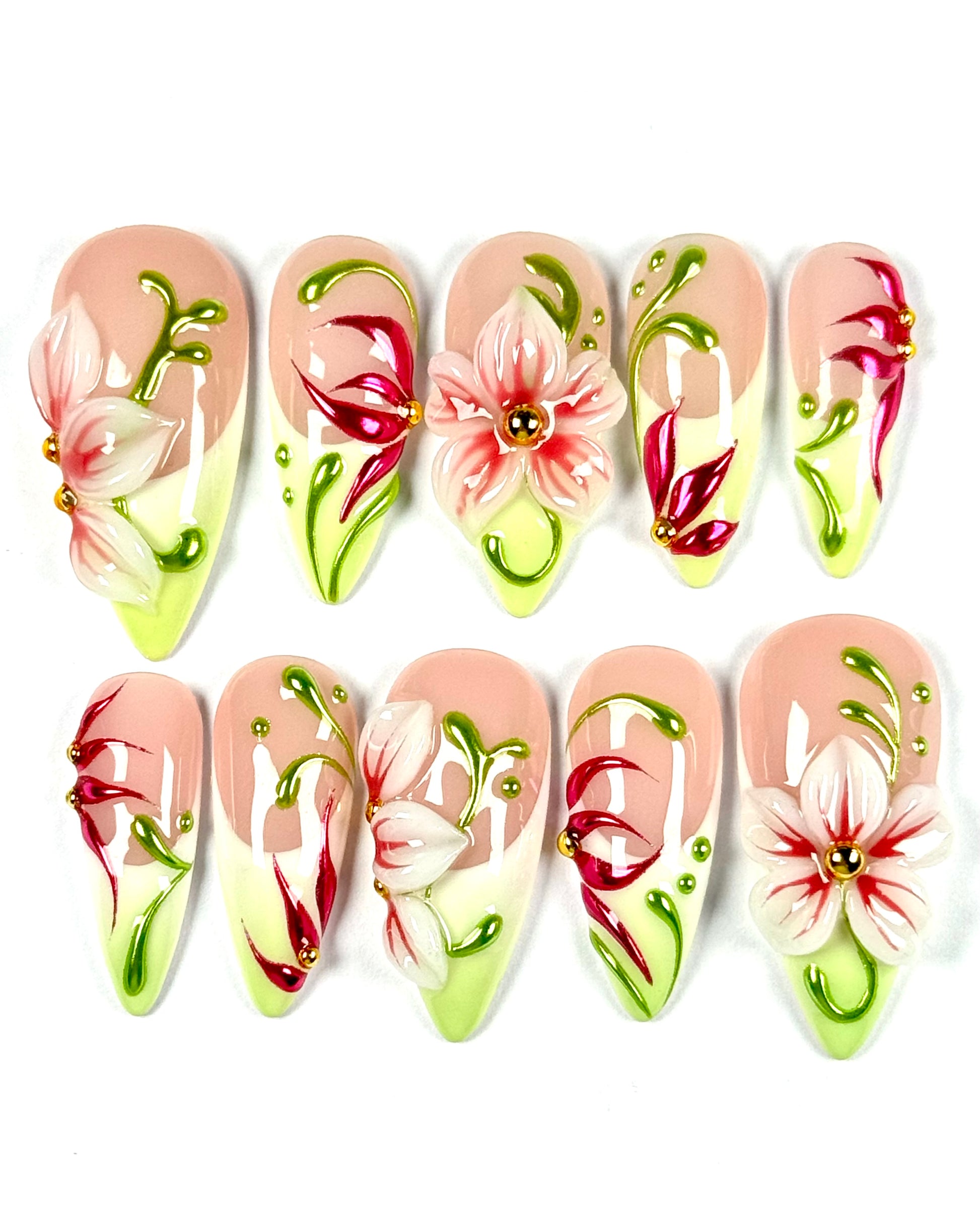 Inspiré de la couverture du roman Meri Jaan d’Océane Ghanem, le set Ola mêle un dégradé vert tendre, des fleurs sculptées en relief et des touches de rosé intense ✨